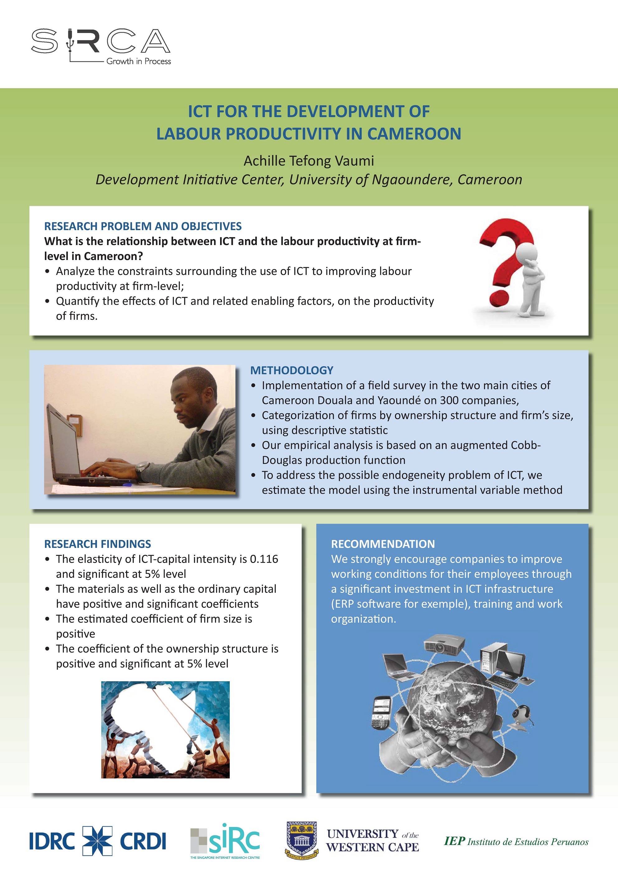 In this study we seek to analyze the constraints surrounding the use of information and communication technologies (ICT) as a tool to improving productivity of SME in Cameroon; and also, to assess empirically whether to what extent those technologies have contributed to the growth of labor productivity within the firms.