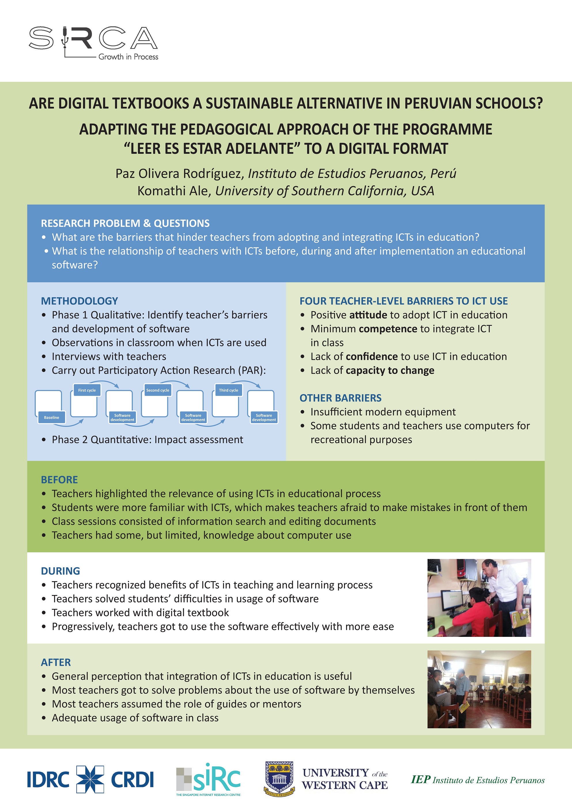The project aims to empower the teaching and learning of reading comprehension and digital literacy in Peruvian primary students by providing schools with specialized digital textbooks, and by training teachers in the use of the provided materials and other digital educational resources. The study will take into consideration various factors regarding the adoption of digital textbooks, such as the perceptions of teachers and students about the materials, the observed learning outcomes, as well as the role they play in the learning process.