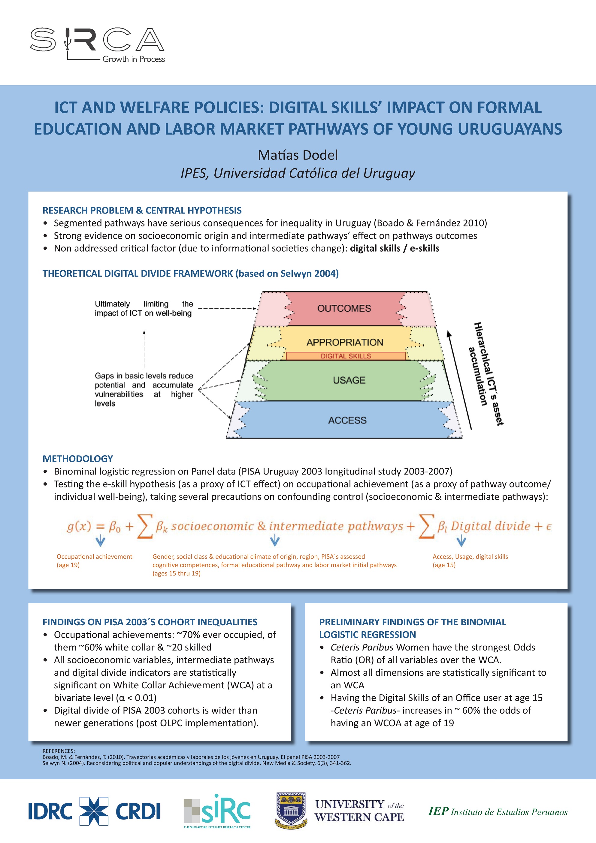 The research aims to generate knowledge regarding the impact of ICT on welfare by assessing digital skills effect in the formal education and labor market trajectories of young Uruguayans. Multivariate statistical models will be elaborated using microdata from the first follow-up Panel study of students evaluated by PISA 2003. His research outline is found here.