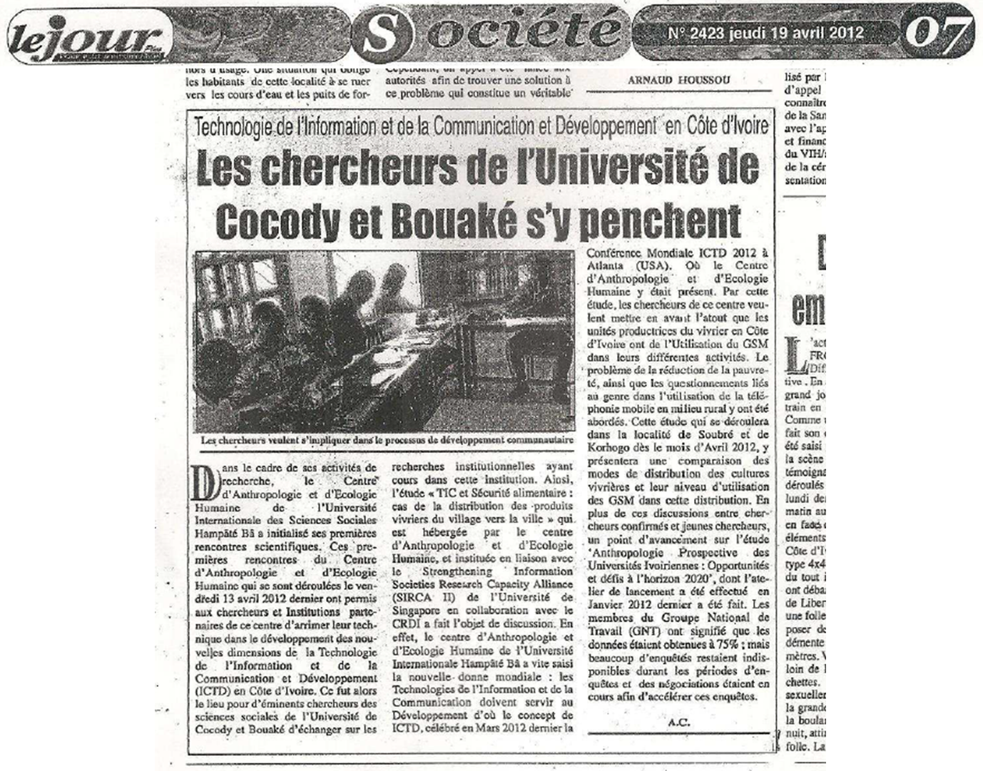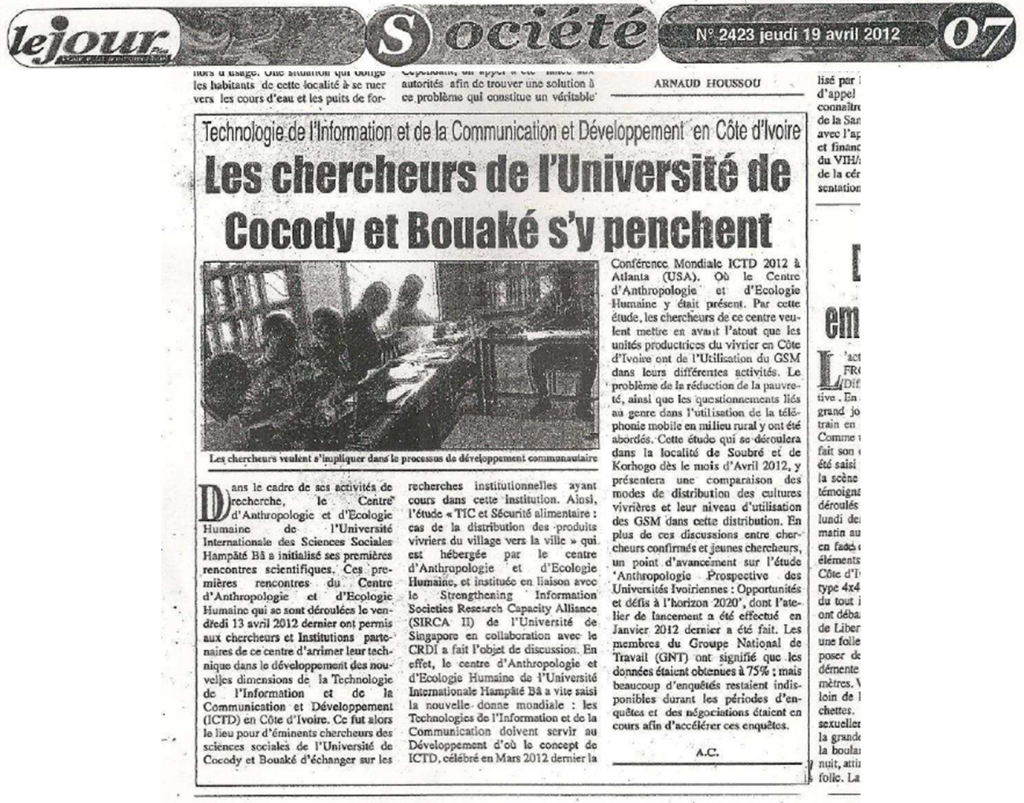 A Principal Investigator from Ivory Coast (Cote d’Ivoire), Kabran Djane, was featured in Ivorian newspapers, “Le Jour” and “Soir Info,” for organizing a successful workshop on ICT and Food Distribution. The workshop was a part of the monthly meeting of the Center of Anthropology and Development (CAEH), and it was supported by SIRCA.