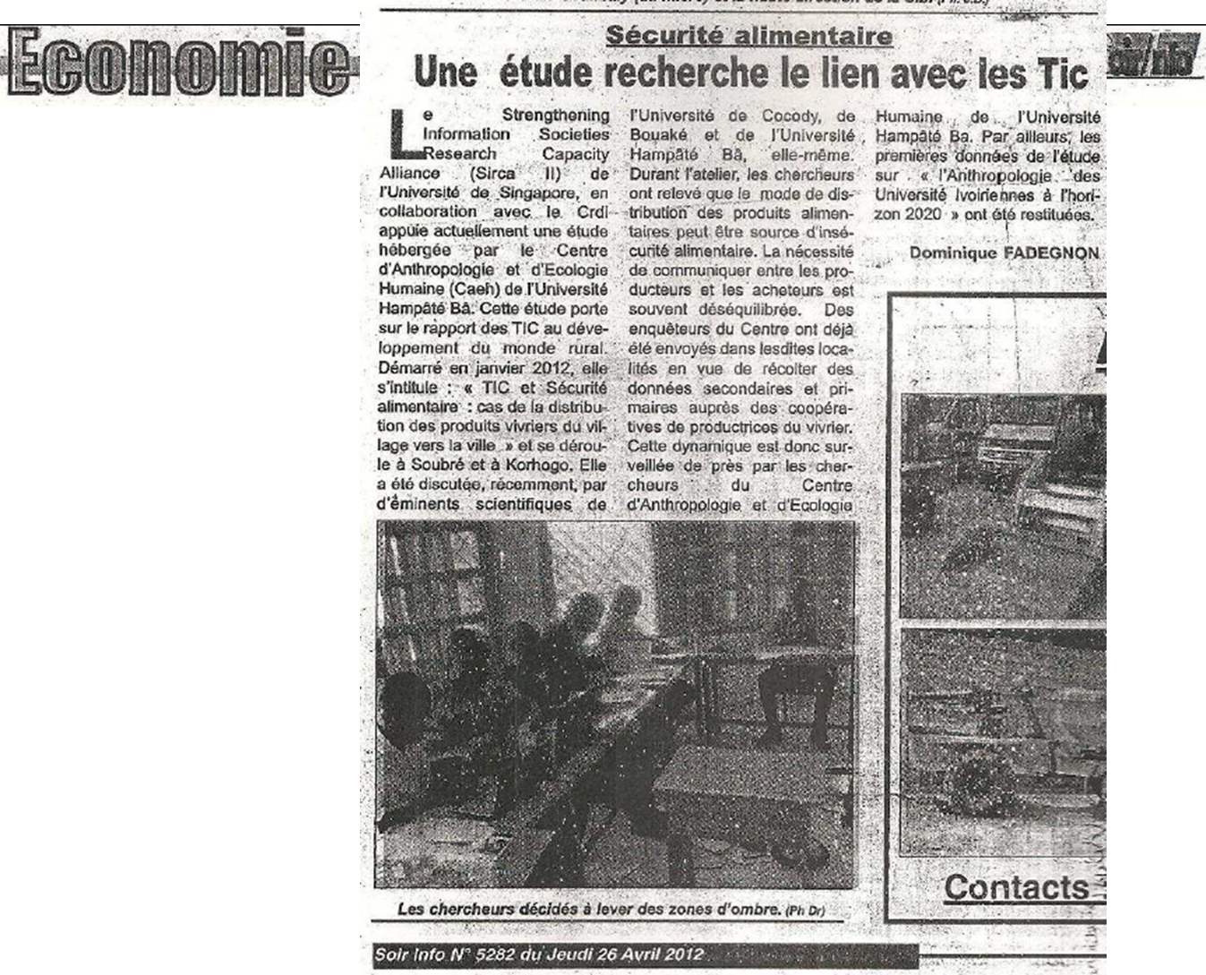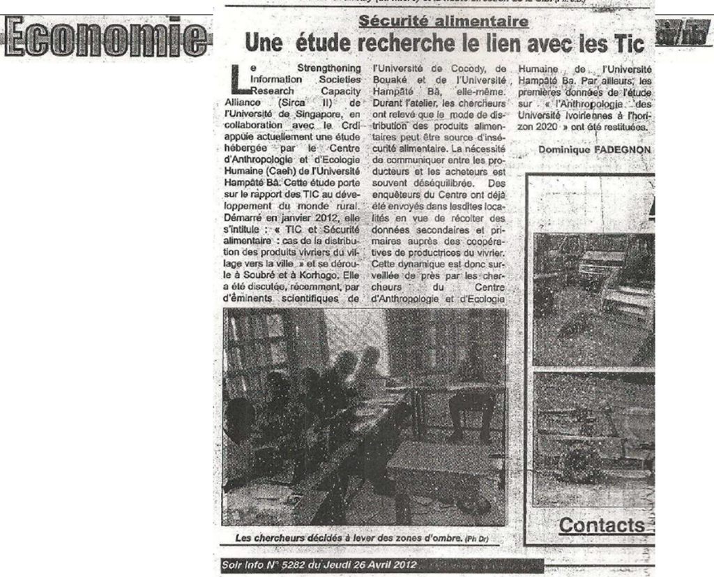 The newspapers have presented the importance of researchers to study ICT and food distribution and the impact of SIRCA in Ivory Coast. Kabran utilized the presentation material that he utilized during the SIRCA March Workshop in 2012, and he improved it based on the inputs of the workshop participants.